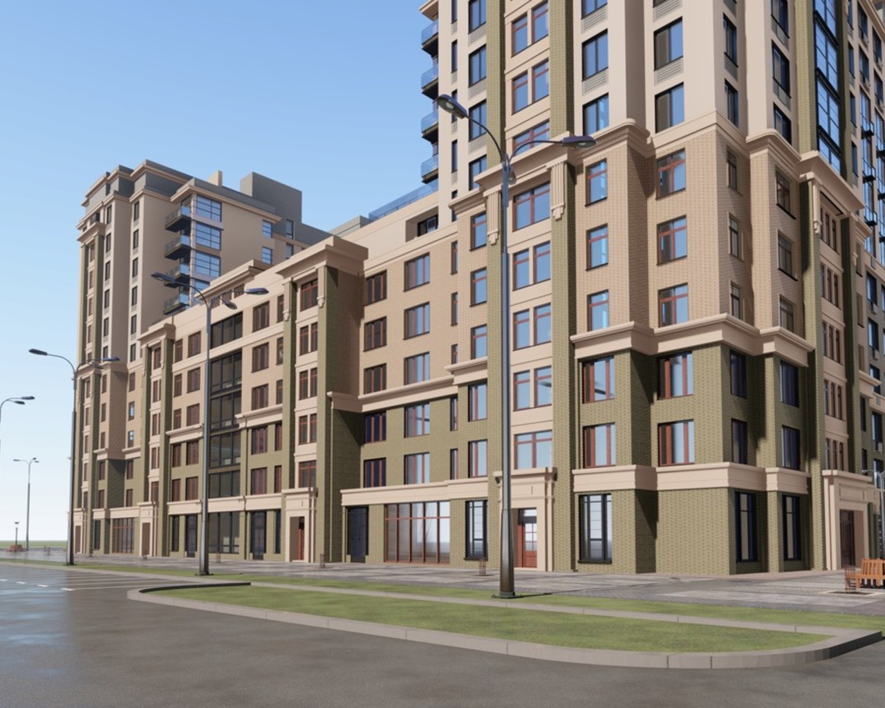 «Название ЖК» — квартал в деловом центре города из шести домов переменной этажности от 5 до 17 этажей с подземным паркингом и закрытыми дворами без машин. Здесь предусмотрены дома п-образной формы от 5 до 17 этажей. Переменная высотность помогает обеспечить нужную инсоляцию квартир, сделать дворы светлыми. Цветовые сочетания фасада и окна разных размеров делают архитектуру разнообразной. Четыре дома сданы и заселены в срок.